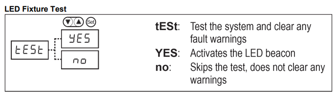 - Hold the set button, scroll to yes, and hold the set button to run the fixture test.