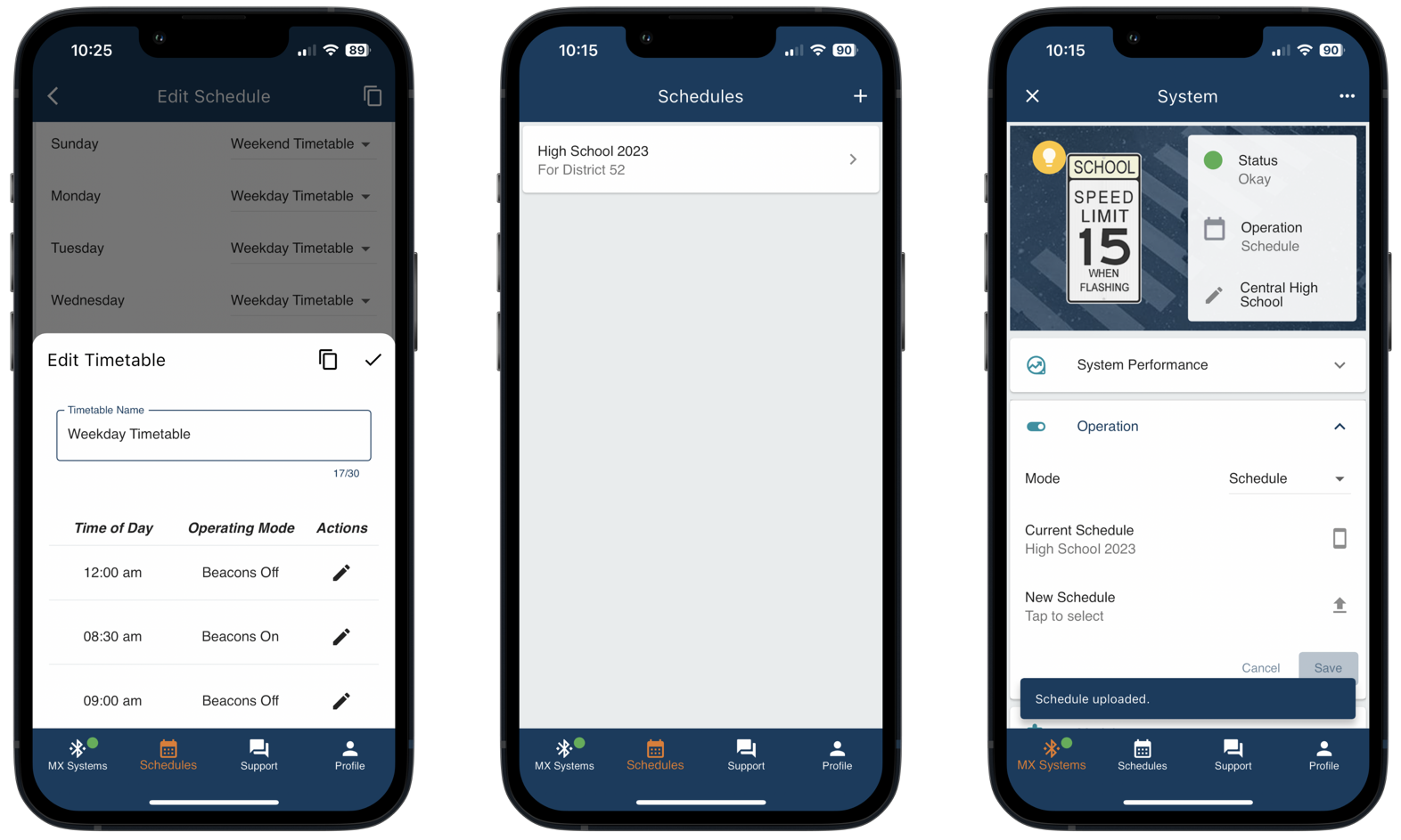 MX systems utilize the MX Field App for local programming, configuration and diagnostics. For more information on the mobile app please see our article here. A schedule can be built and uploaded to a system from your mobile device.