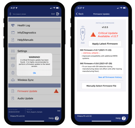 A firmware update will be prompted upon connection if there is an update available. Press the Firmware Update button and select Apply Latest Firmware.