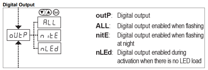 The nLEd setting will ensure no LED faults are displayed on the EMS user interface and it will ensure the digital output remains active with no LED load connected. This digital output is used to send 12VDC out to applications like overhead lighting after the pedestrian push button or passive detector has been activated. This voltage will remain active during the crossing phase only.