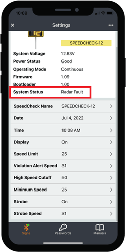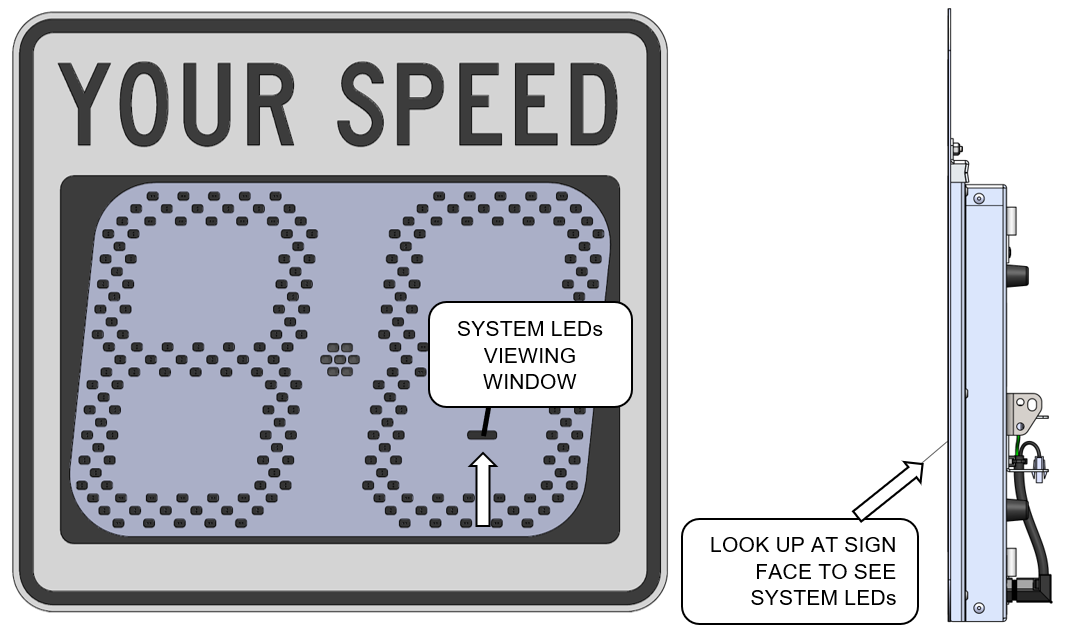 The SPEEDCHECK-12 has built-in status LEDs that can be seen, from below, in the bottom right hand corner of the display. There are shields that direct the LEDs downwards so they can only be seen from an angle from below the sign and not directly on. In order to view the system LEDs, look up at them from below the viewing slot in the silkscreen.