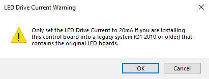 This is used to change the drive current setting for the LED display boards. The current standard is 10 mA. The 20 mA setting is only used if you have installed the replacement controller above into an older system from 2010 or older. These systems utilized LED display boards that were less efficient and require a higher current setting to be at an equivalent brightness to the current revision display boards. Reference our controller replacement guide for more information on adjusting this setting.