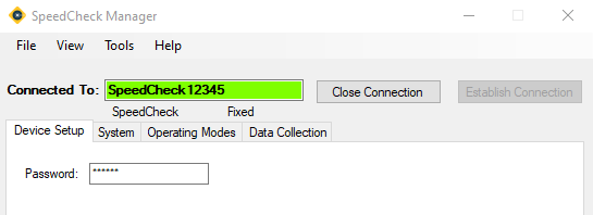 The Device Settings tab within SpeedCheck Manager is password-protected by default to ensure it is only accessed by qualified personnel familiar with the adjustments to be made for your application. The password that needs to be entered is shown below:
