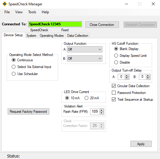 This article shows the password required to enter the Device Setup tab within SpeedCheck Manager, and details common parameters involved during setup.